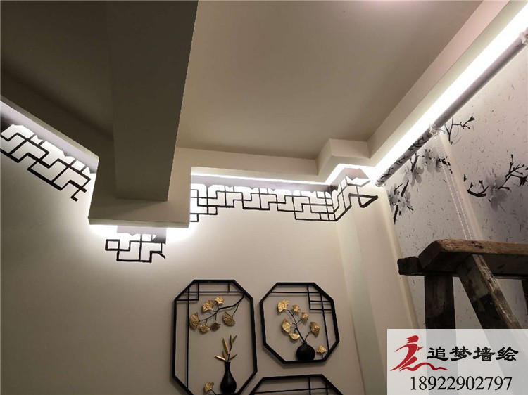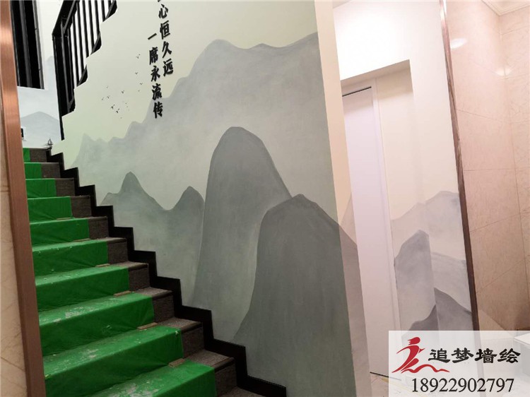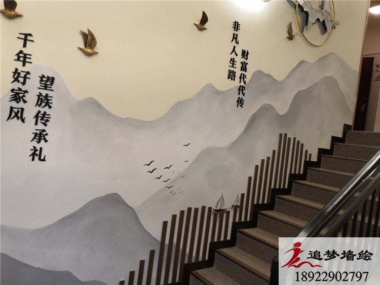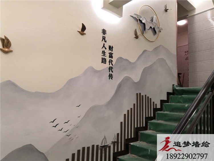 墻繪項目介紹:整個樓道的彩繪以水墨山水畫以及一些微派的建筑為背景,加以少許花朵樹枝點 綴,勾勒出一幅峰巒疊嶂的秀麗境色。為了拒絕視覺疲勞,我們為此專門在樓道增加了一些立體飛鳥和山峰。