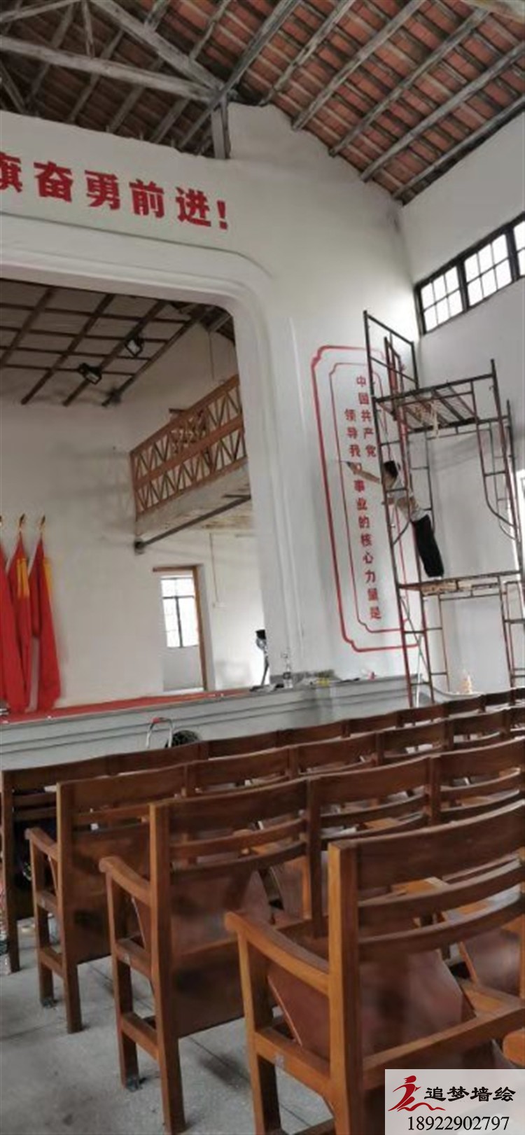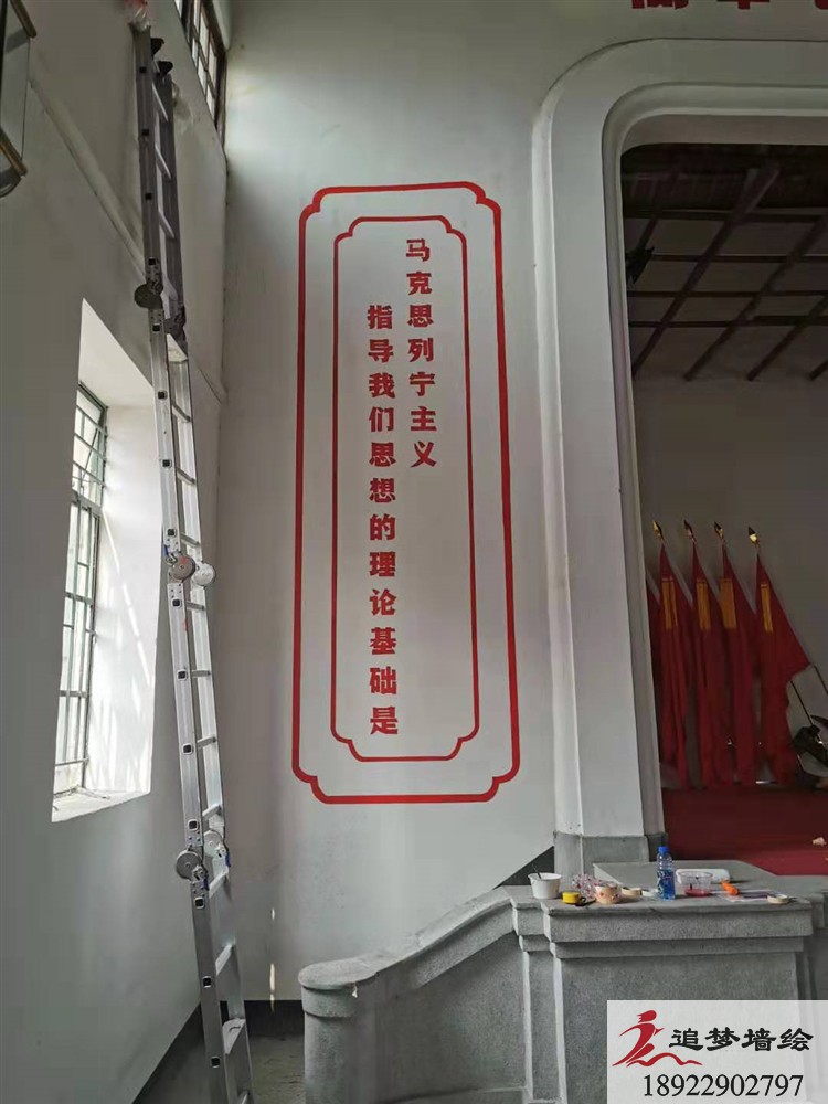 2019年9月追夢墻繪在東莞東坑鎮開展工作,為東坑鎮黨支部的會議室進行裝飾工作,在會議室上面看到的一大橫幅“人民對美好生活的向往 就是我們的奮斗目標”,還有“高舉毛澤東思想的偉大紅旗奮勇前往”與兩旁的“馬克思”“中國共產黨”。裝飾完了室內,我們還外面的墻繪繪畫上了韻味十足的社會主義核心價值觀十二個詞。以下就是一些現場的圖片。