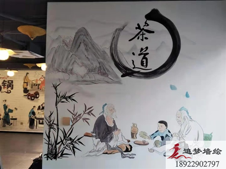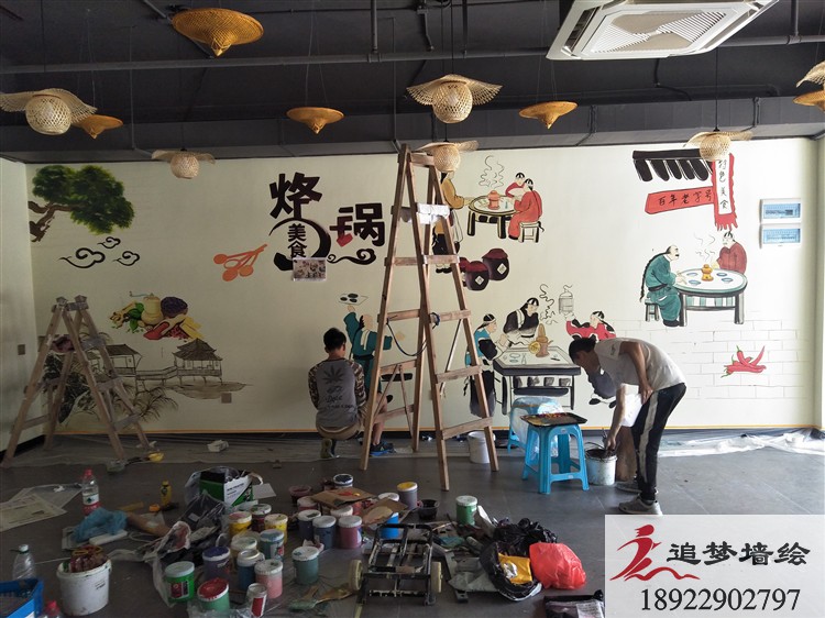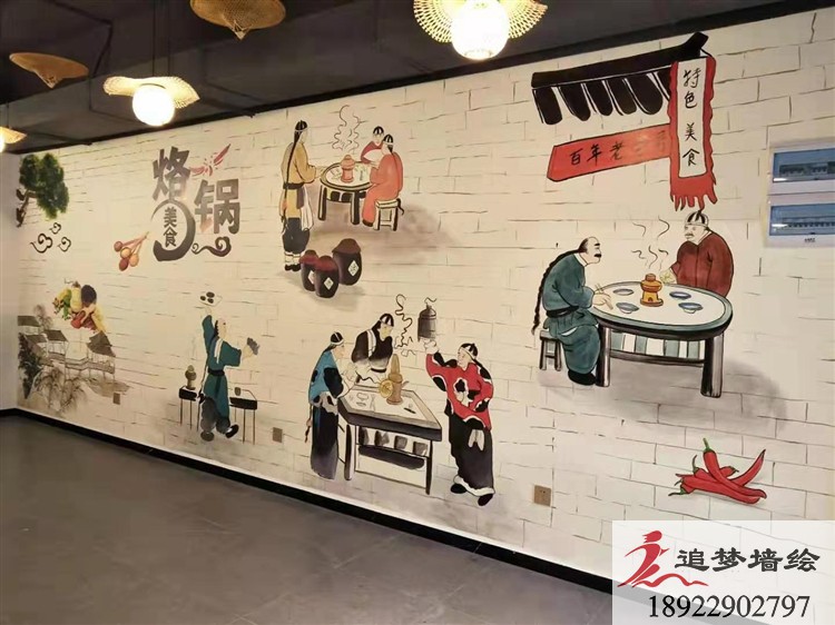 如今,人們不僅關注火鍋是否美味,更關注火鍋店的氛圍了。火鍋店裝修大致分為大眾火鍋店、高端豪華型、特色風味型和自助型。不同類型的火鍋裝修風格不一樣,高端豪華型的火鍋店裝修風格,典型的就是北京“海底撈”。很多人慕名而來,一是為了體驗海底撈的服務,一是感受海底撈貼合人性的裝修設計。吃火鍋不僅是吃美食,吃火鍋更是一種文化,合理用墻繪去表現火鍋店文化是非常好的方式,下面來看看我們最近為雞肉餅火鍋店的墻繪: