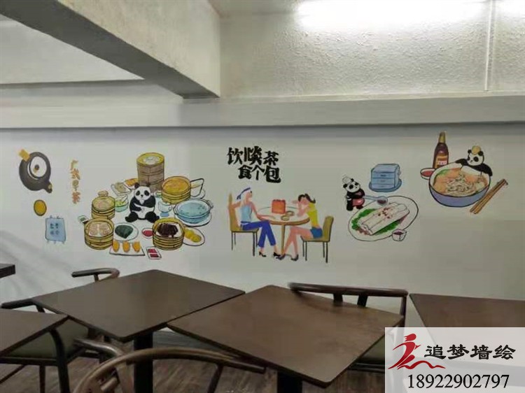 彭少茶餐廳墻繪。這個項目是2019年9月底,在廣州江南西地鐵附件的茶餐廳。樓梯間繪畫了“樓上有戲”趣味字,整體風格以港式茶餐廳為主,加入了一些粵式茶餐廳的風格,使得整個店面看起來不那么空洞,充滿“茶餐廳的氣氛”此類圖案與廣東話有點類似,接地氣,通俗易懂,使得店與人更有“親和力”。