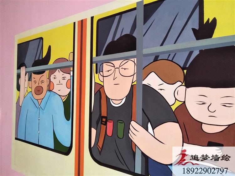 追夢墻繪從事專業藝術繪畫15年,承接各種類型的墻繪。今年8月在廣州某商場繪畫了一些趣味畫面,在經過與商家多次交流后才將這些畫面一一展現。首先是飛躍出電視屏的地鐵、正在安檢乘客的工作人員、擠在地鐵里的乘客還有商場的導覽圖等。展現了一張張可愛有趣的畫面,很好達到娛樂場所的活躍氣氛。