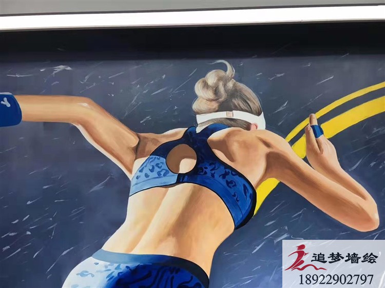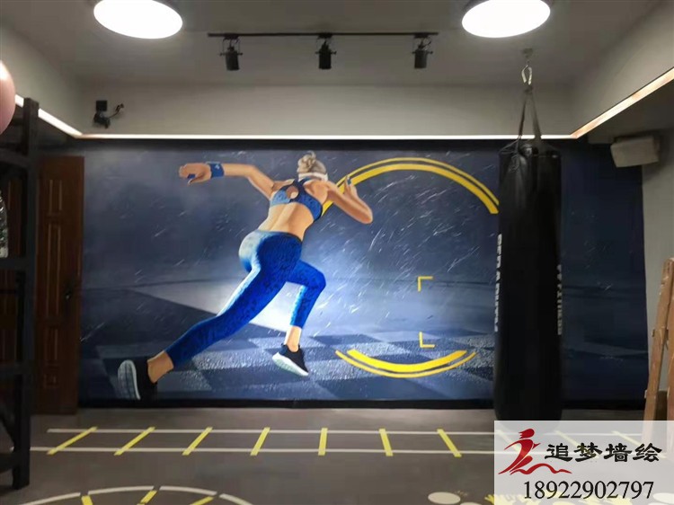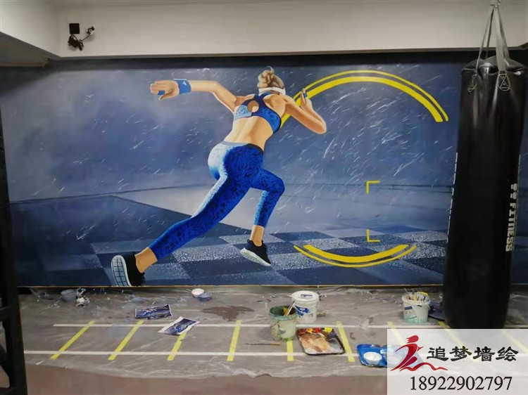 這是十月底一位來自廣州體育西的客戶,他開的是健身房,就這一面墻,但面積也不小了。他要我們畫一幅有強烈3D感的健身彩繪,并且把一張阿諾德·施瓦辛格的墻繪發給我們參考。很快我們就設計了幾張圖給他看,看了之后他感覺還不是很好,而且想畫女性健身畫試試,所以我們又開始忙活起來,設計了兩三張女性運動的圖給他看。他就看上了這張,但他說怎么都是黑白色,想來應該是他發的那張圖我們誤解了他的意思,于是就簡單的上色,然后P上到現場圖。給客戶看過后,他覺得很滿意,還問我們什么時候去畫,我們第二天就安排畫師過去畫,幾個小時就畫完了,就這樣這個項目迅速的完成了。