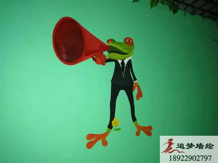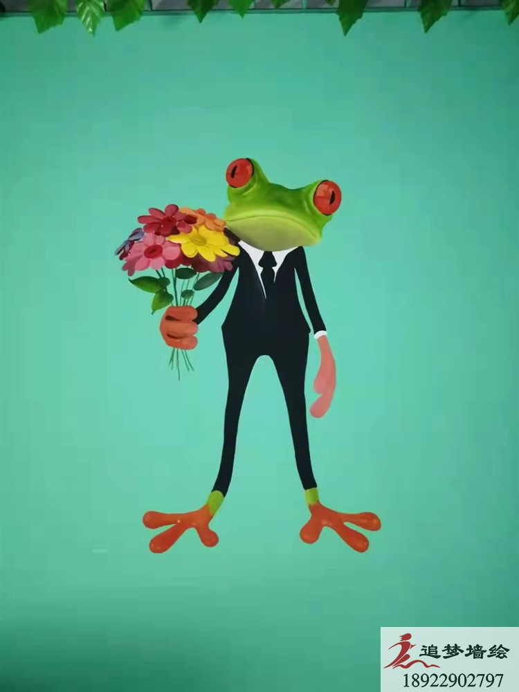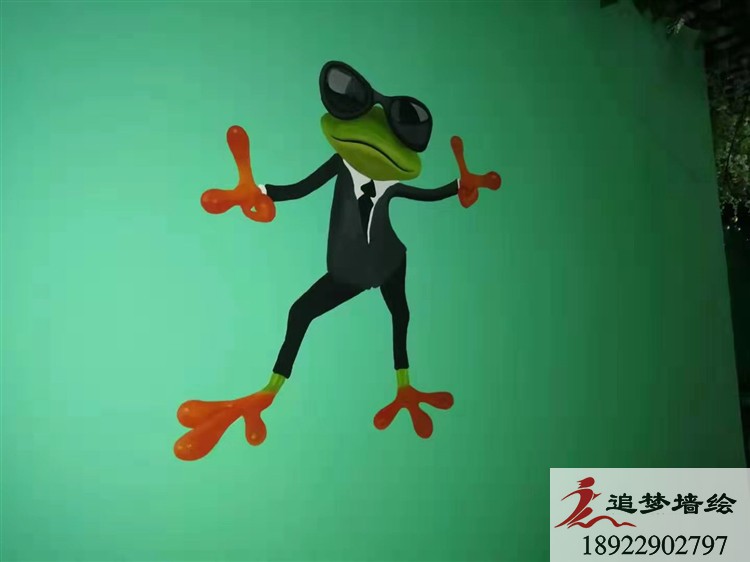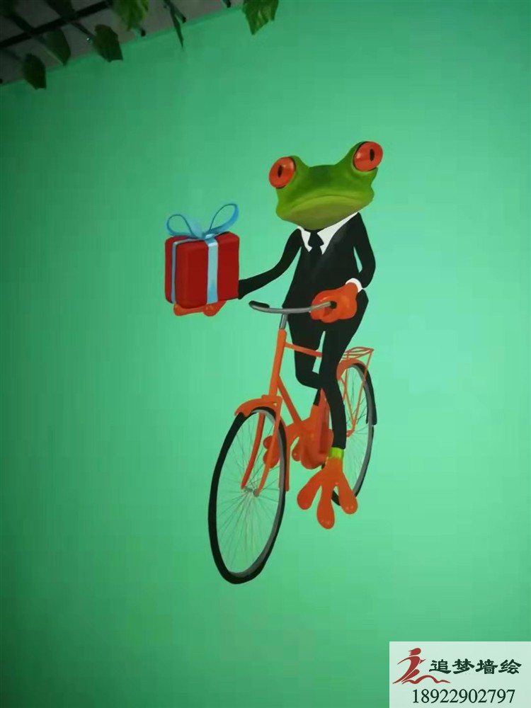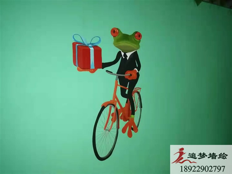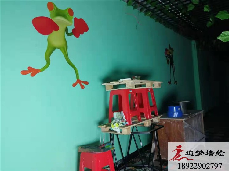 10月中旬我接到一個東莞的客戶要求做墻繪,他說主要是經營與蛙有關的餐廳,如牛蛙火鍋等,想要一些簡潔卡通蛙就好,到時候他還會配一些掛畫。我花了點時間到的現場看一下,大概量了下尺寸,還有拍一些現場圖,然后與客戶聊了一會,問他還有沒有其他的需求,什么時候開業等,確認好后,我回到公司馬上開工。規劃畫10只青蛙,然后各個青蛙動作形態各不同,再給客戶過目后再過去繪畫,因為客戶月底就開業了。客戶確認好沒什么問題了,我們的畫師馬上就到現場去繪畫,一兩天的時間就畫完了。于是各種各樣的有趣躍然墻上,有騎單車的、有拿喇叭喊話的、有手捧鮮花的、有在練習拳擊的等等。