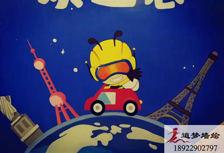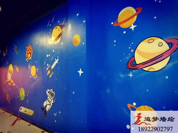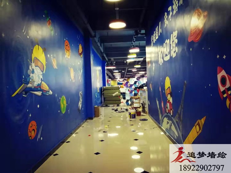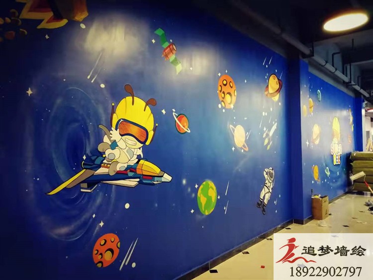 東莞市蜜蜂超人親子游樂園。這個游樂園是做蜜蜂超人卡通吉祥物的公司設計裝修的,但是裝修的時候他們想要裝修形式多一些,他們用了噴繪、貼紙等形式,還想要用墻體手繪的形式,所以就找到我們追夢墻繪,他們把游樂園的裝修風格色調,還有他們做的蜜蜂超人吉祥物給到我們。我們按照他們要求設計了一些以藍色背景為主的卡通科技航天畫面,他們看到很滿意,但還想要加些東西,于是他們就自己在我們設計的基礎上加了一些星星、流行。因為加的東西不多也不復雜,我們經過協商后就確定下來了。繪畫的時間也就三四天,很快完成了,客戶他們說手繪上去的感覺就是比那些噴繪貼紙好,以后還有需要會繼續與我們合作。