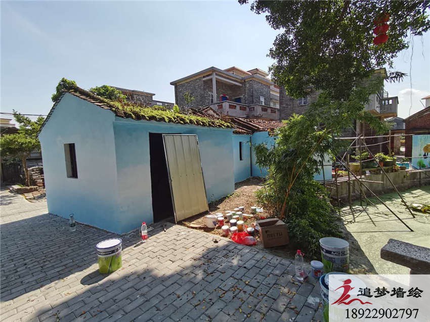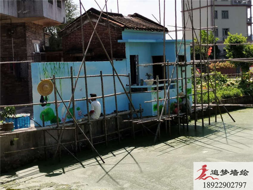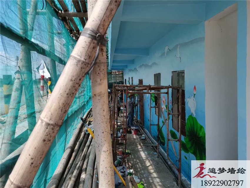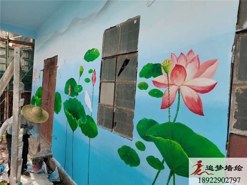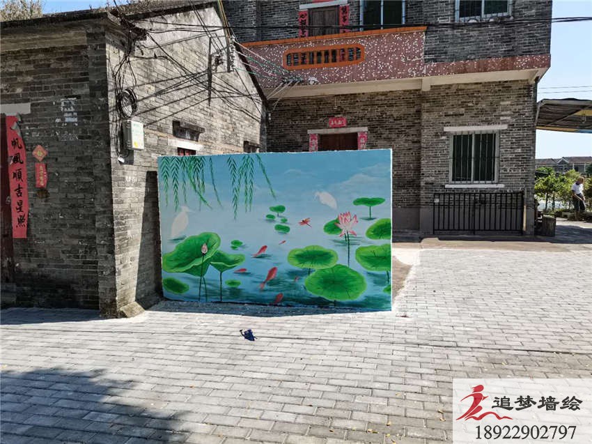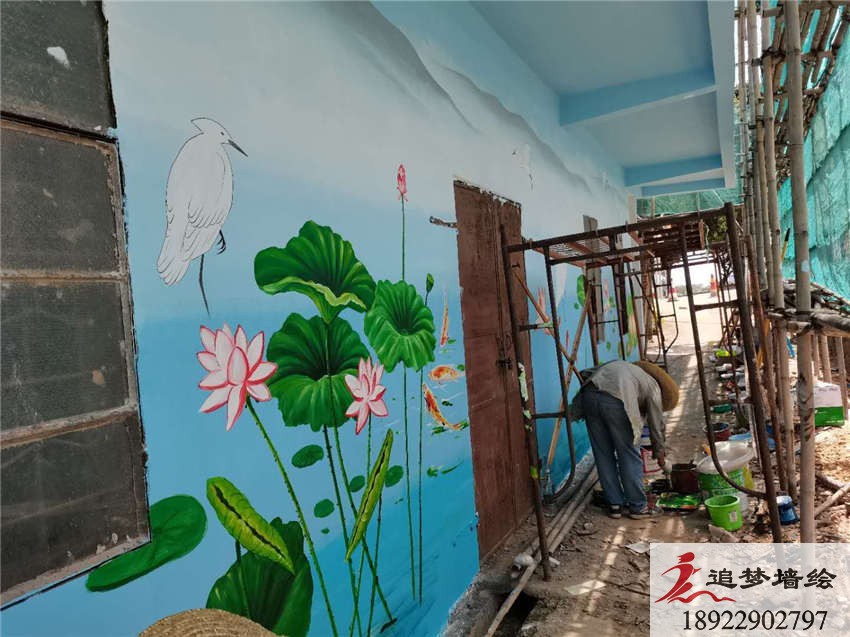 墻繪項目介紹:江門鶴山文化墻主要繪制彩繪圖案是和鶴山文化有關系的,整體設計圖案圍繞詠春拳,荷花,白鷺,鶴山醒獅,石板橋為主題,突出鶴山市當地小橋流水人家的人文環境。墻繪整體基調色彩明朗,展示出當地的文化底蘊和環境優美的特點