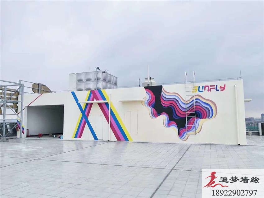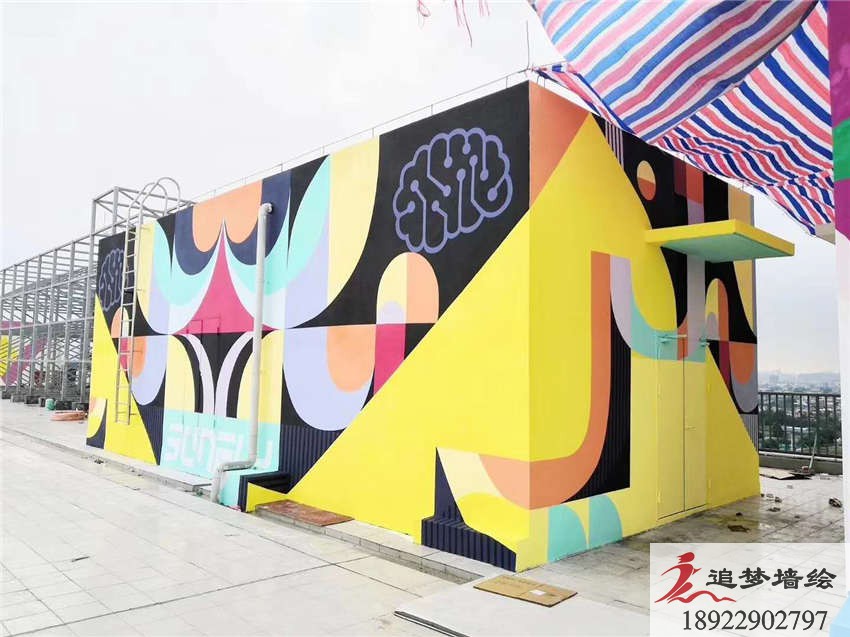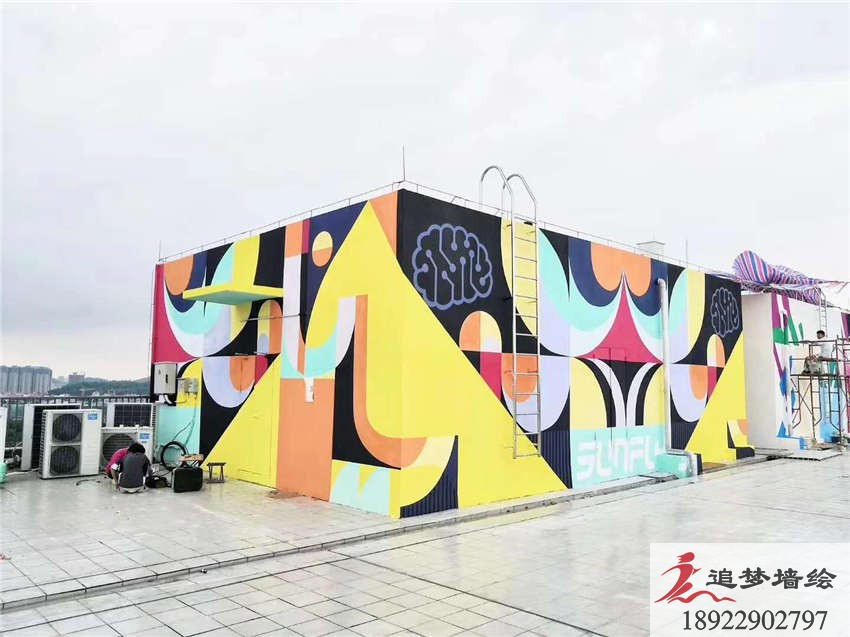 墻繪項目介紹:網紅墻主要繪制彩繪圖案整體設計圍繞視覺效果符合年輕人,突出潮流,鮮明色彩,圖案是以年輕活力的色彩搭配色塊和字母相結合,不規則的圖形和大膽的色彩讓墻繪整體活潑、明快,展示出樂觀積極向上!