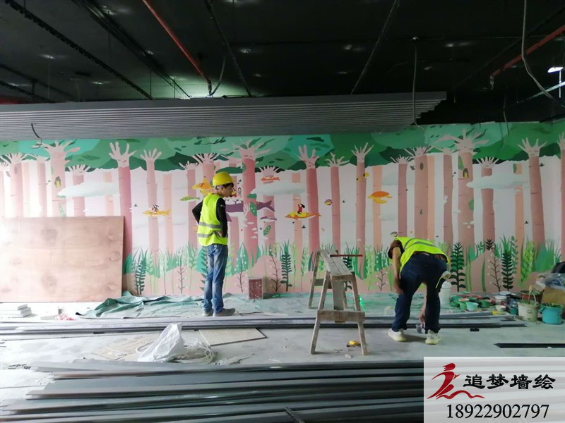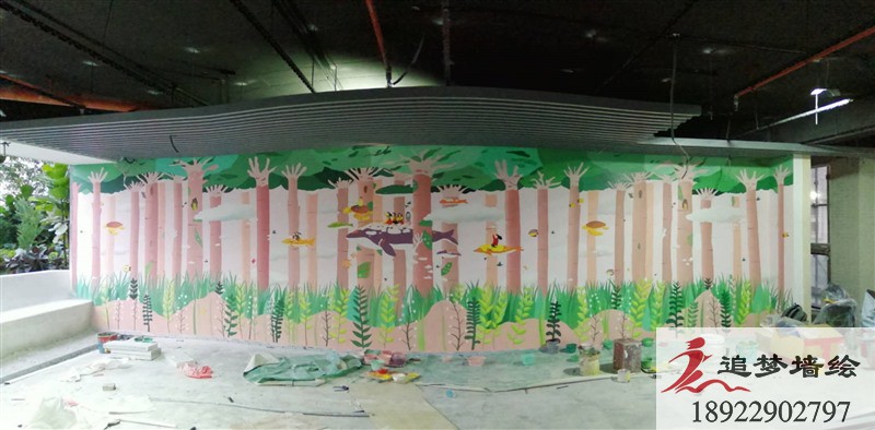 墻繪項目介紹: 南沙這個的項目主要繪制彩繪圖案整體設(shè)計畫面主要以卡通風格為主。圖案是結(jié)合了繽紛視界書集的插畫元素和以森林為主的花草,樹木的表現(xiàn)形式,突出了自然并玄幻的畫面。墻繪整體畫面精彩生動,色調(diào)明快,協(xié)調(diào)統(tǒng)一。
