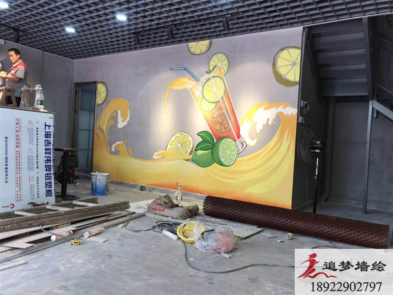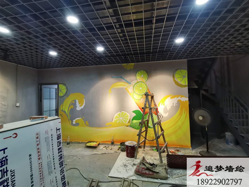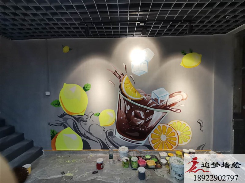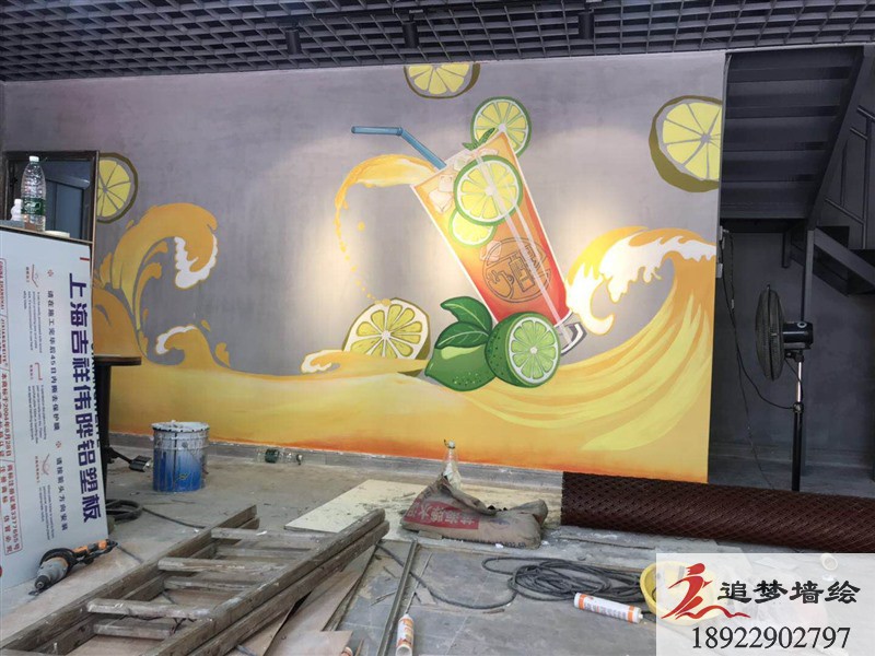 墻繪項目介紹:中山這個項目的彩繪在不同的墻面設(shè)計不同的檸檬茶彩繪圖案。設(shè)計師以卡通風(fēng)格為主,用各種和諧的檸檬茶卡通元素場景把畫面做的精彩生動,色調(diào)明快,協(xié)調(diào)統(tǒng)一,突出了卡通風(fēng)格生動,樂觀積極向上的內(nèi)容。