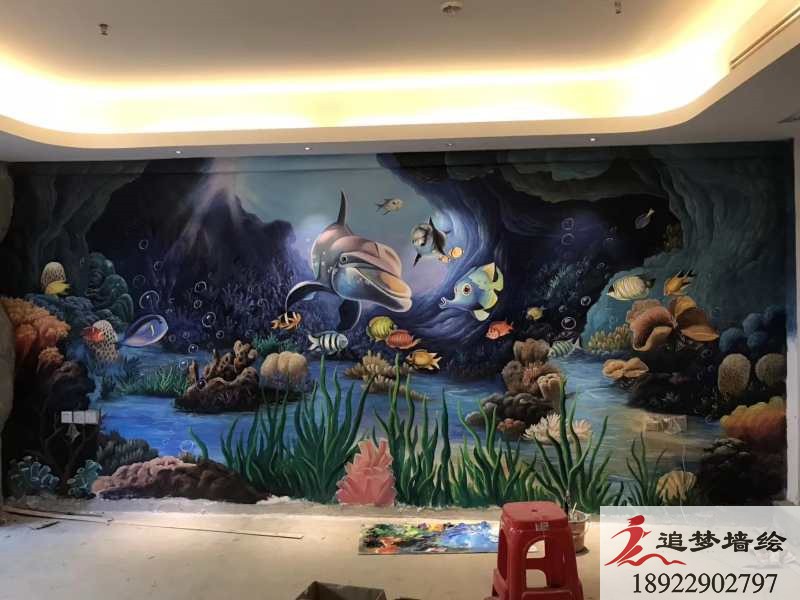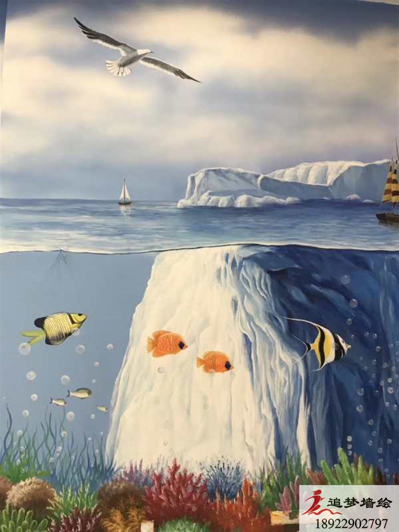 墻繪項目介紹:白云這個項目的彩繪在不同的墻面設計不同的彩繪圖案。我們設計師以油畫風格為主,用各種各樣和諧的海洋場景把畫面做的精彩生動,色調明快,協調統一,展示了符合海洋氣息的內容。