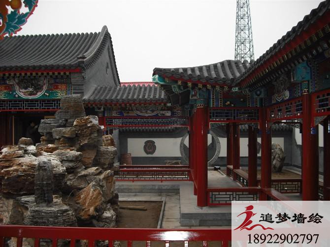 墻繪項目介紹: 這個項目的彩繪方式是和璽彩繪,金鳳和璽彩畫是建筑常見而重要的裝飾手法。它構圖嚴謹,圖案復雜一般只用于宮殿、壇廟等大建筑物的主殿,和璽彩繪表現了先進的營造技藝,又蘊涵著深厚的文化底蘊, 具有極高的美學價值、學術價值和使用價值。