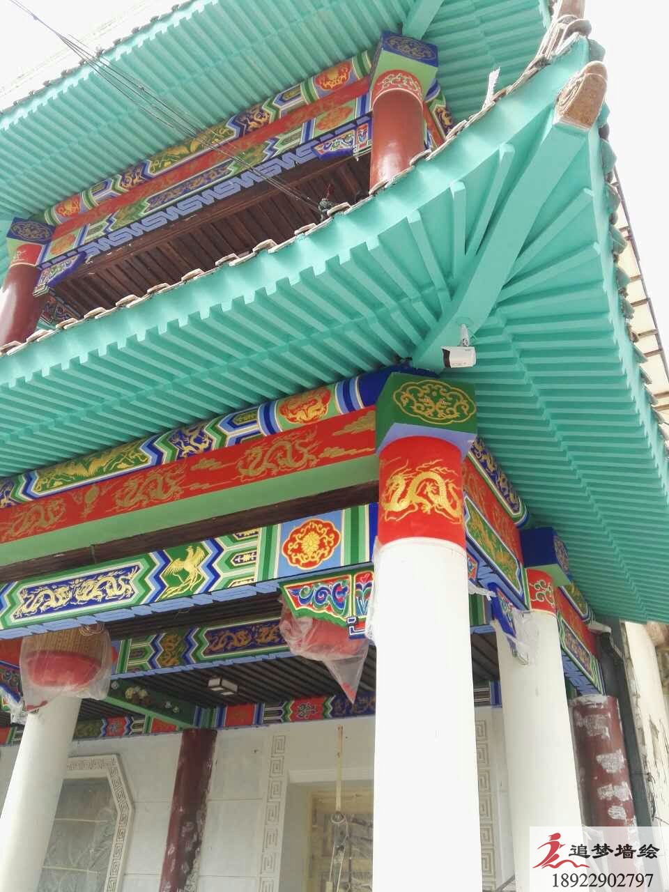 墻繪項目介紹: 這個項目的古建筑彩繪是根據廣西文化和寺廟風格進行彩繪圖案設計。是由蘇式、旋子、和璽彩畫融合而成的彩繪效果與其他古建筑彩繪風格大致一致,卻體現了當地特色習俗與審美。用豐富色彩把畫面做的精彩生動,色調明快,協調統一,具有地方特色。