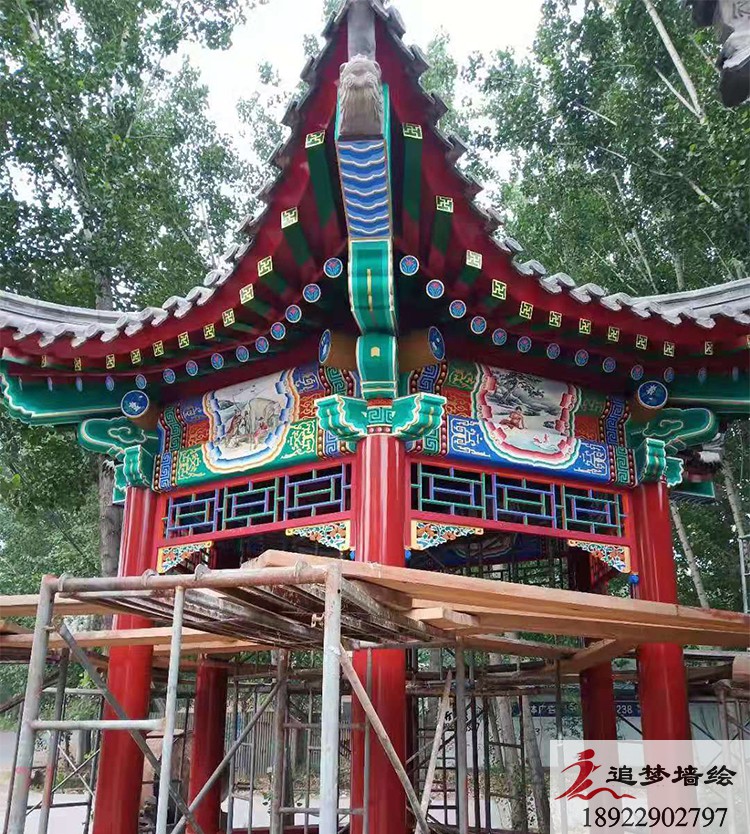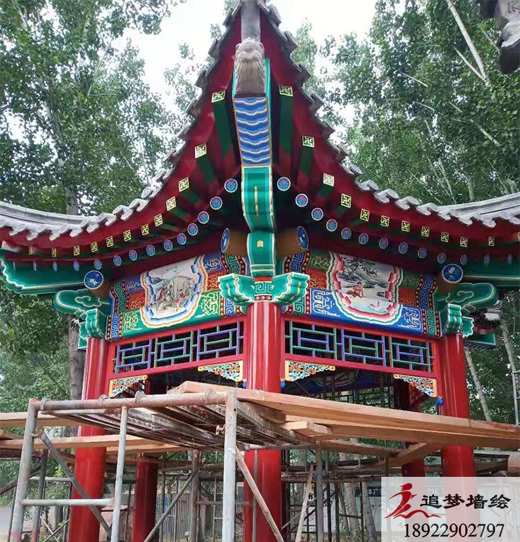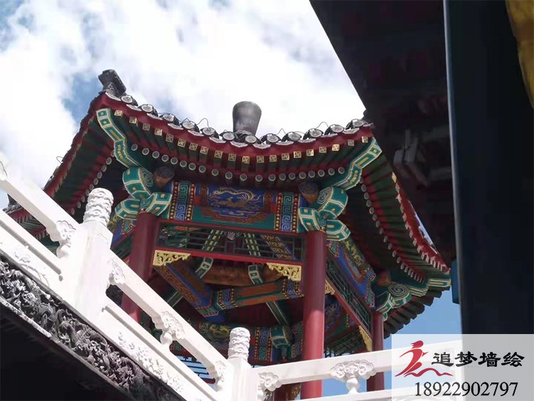 墻繪項目介紹: 這個項目的古建筑彩繪是根據嶺南文化進行彩繪圖案設計。是由蘇式、旋子、和璽彩畫融合而成的彩繪效果與其他古建筑彩繪風格大致一致,卻體現了當地特色習俗與審美。用豐富色彩把畫面做的精彩生動,色調明快,協調統一,具有地方特色。