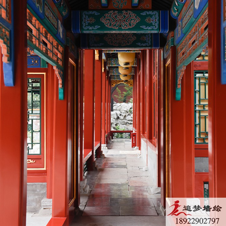 墻繪項目介紹: 這個項目的古建筑彩繪是根據嶺南文化進行彩繪圖案設計。是由蘇式、旋子、和璽彩畫融合而成的彩繪效果與其他古建筑彩繪風格大致一致,卻體現了當地特色習俗與審美。用豐富色彩把畫面做的精彩生動,色調明快,協調統一,具有地方特色。